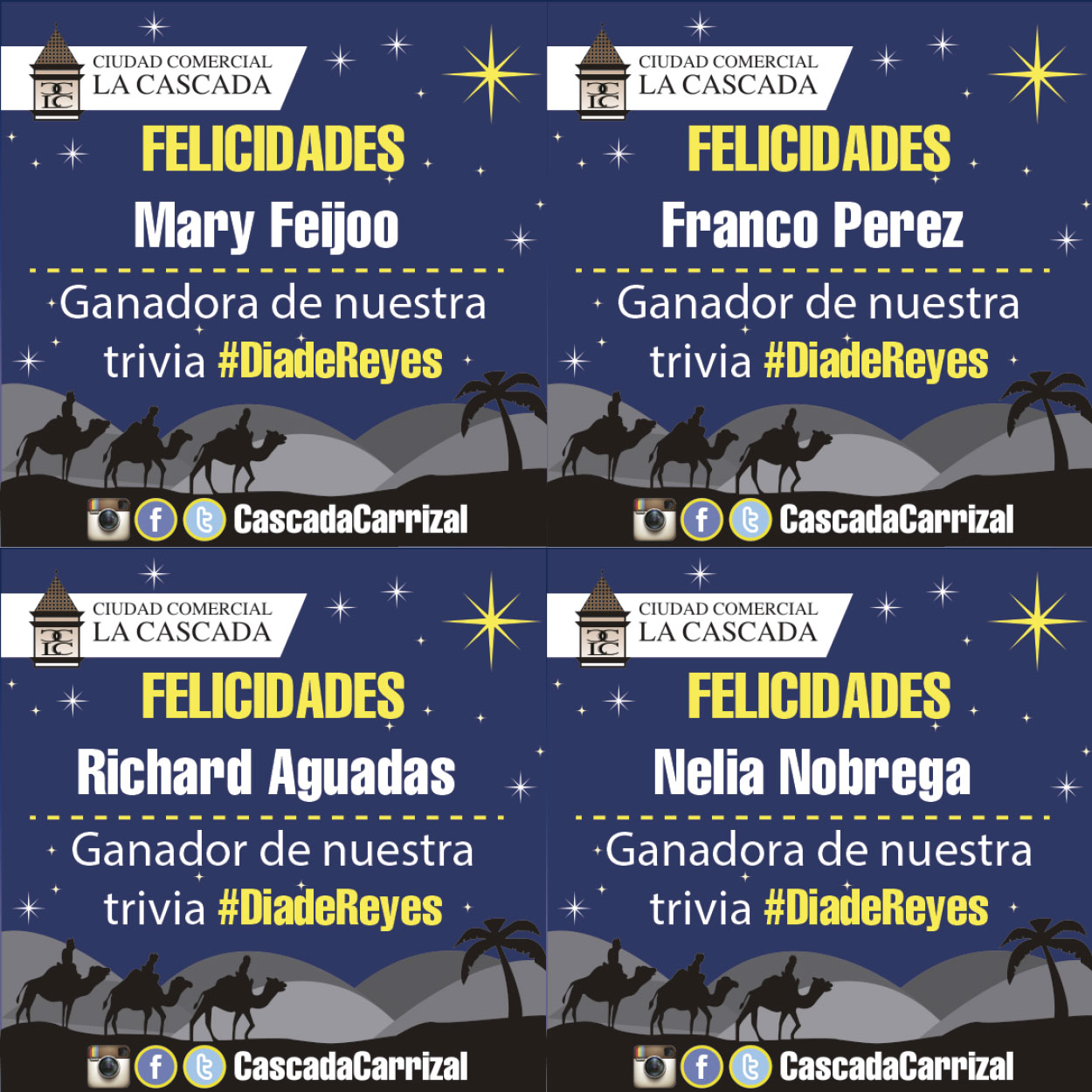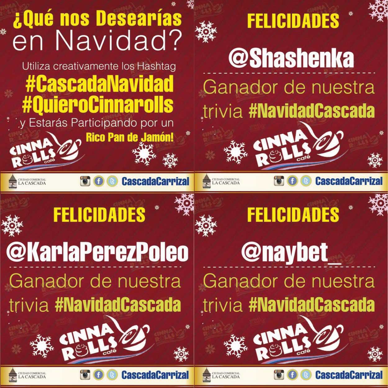 Estos fueron los ganadores de nuestra trivia #NavidadCascada quieres disfrutaron de una rico pan de jamón cortesía de @cinnarolls, muchísimas gracias por participar y a los demás participantes que no resultaron ganadores no se desanimen pronto vendremos con mas trivias para ustedes. Así que síguenos en tus redes sociales favoritas y no nos pierdas la vista.